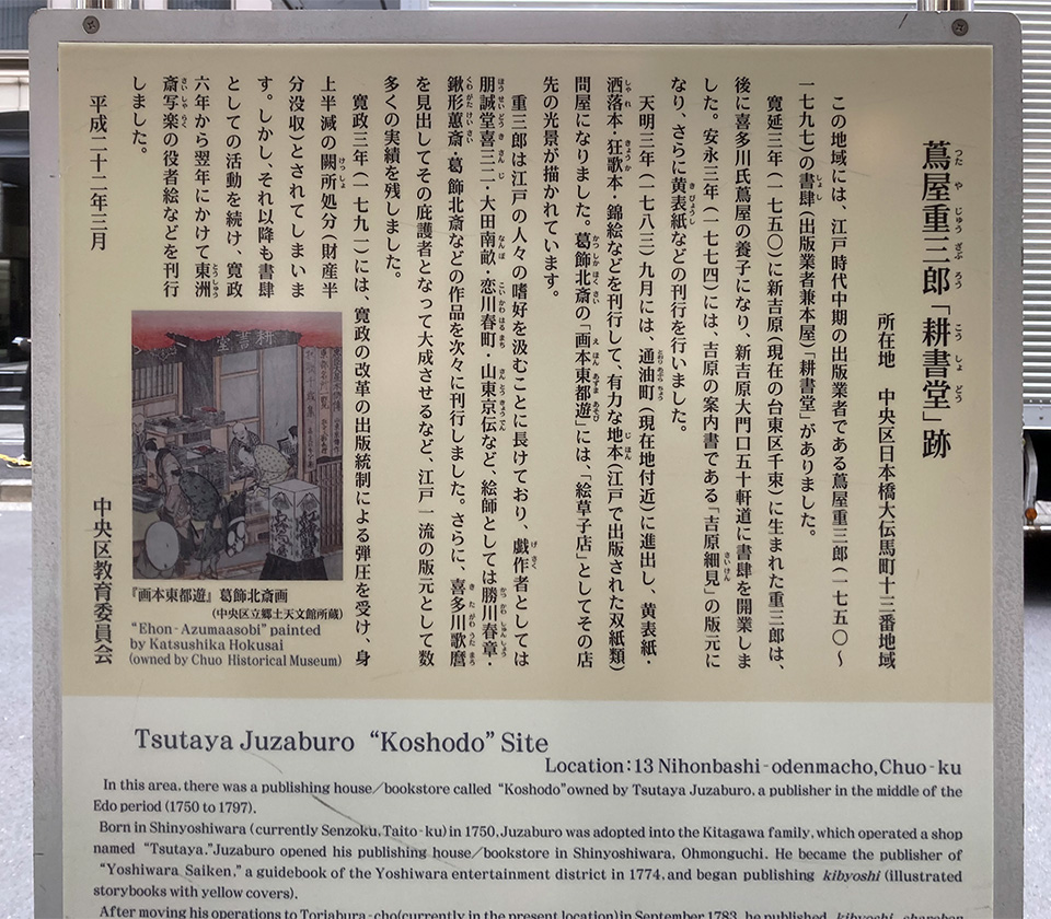 日本橋にある耕書堂跡の案内板ほ:粋と流行りで洒落のめしていた蔦重たちと、質素倹約で地道が身上の伊勢商人とは、あまり意気投合はしなかったかもしれませんけどね… 「つまんねぇ奴らだぜ、なぁなぁ言いやがって」とか、江戸っ子は言っていそうでしょ。反りが合わなかったかな。