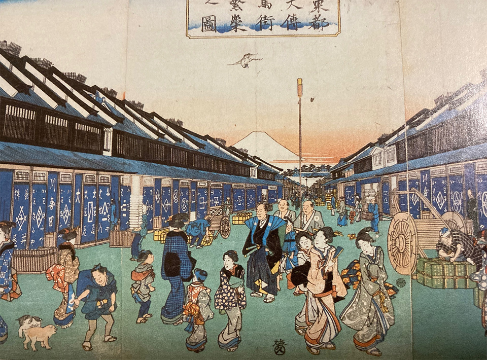 悦:蔦重の耕書堂の前の道を数分も歩けば伊勢店がずらりと軒を並べる大伝馬町、堀留町、本町、駿河町があります。最盛期には松坂だけで50軒が江戸に店を持ち、また周辺の蛸路、射和や中万、相可、さらには津や白子などから進出したお店の多くが日本橋界隈に集中しているのです。またそこで働くのは、大方が伊勢出身ですから、町では伊勢弁が飛び交っていたはずです。
